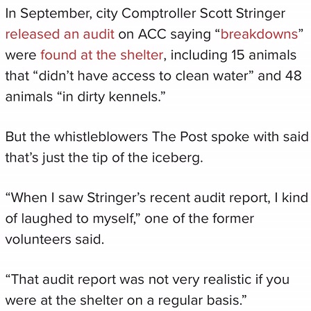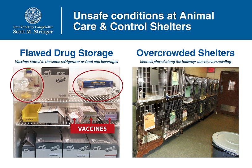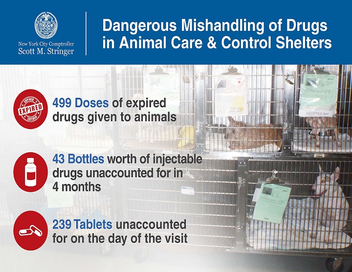 The Audit conducted by NYC Comptroller Stringer in April 2015 showed improper handling of drugs and poor shelter conditions at Animal Care & Control.