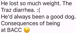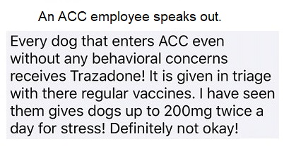 A vet would never prescribe so many psychiatric meds. But at the ACC, this is all done under the aegis of the Department of Health. The ACC must stop the drugging and get the dogs out for exercise and interaction with people.